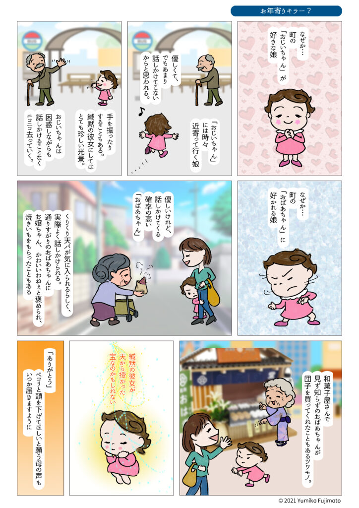 療育マンガ劇場 ★お年寄りキラー? 2021年7月12日 / 療育マンガ劇場 第11話「お年寄りキラー?」 場面緘黙症を持つ娘が、なぜか自然に好意を抱く相手。 そしてなぜか自然と好意を抱かれる相手。 それは娘の7不思議の1つである。 療育マンガ劇場 第11話「お年寄りキラー?」 *無断転用・転載禁止*本作品は著作権によって保護されています 関連記事「かんもくっ子が話せる意外な人」 前のページ > < 次のページ HOME BLOG TOP Follow me! FacebooktwitterHatenaPocketCopy